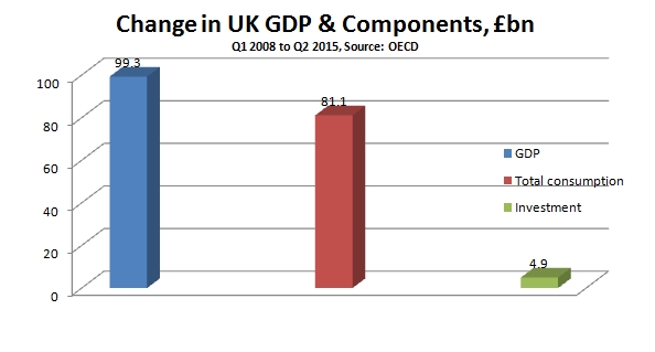 SEB has shown that growth is required to raise living standards and that growth itself is primarily determined by the rate of investment. It is because the rate of investment is so low in the British economy that there has been no growth in living standards since the crisis began. The economy has expanded by just £100bn from the 1st quarter of 2008 to the 2nd quarter of 2015, less than 6% in over 7 years. But of this growth £80bn has been the growth of consumption while just £4bn has been a rise in investment. We remain in an investment crisis.